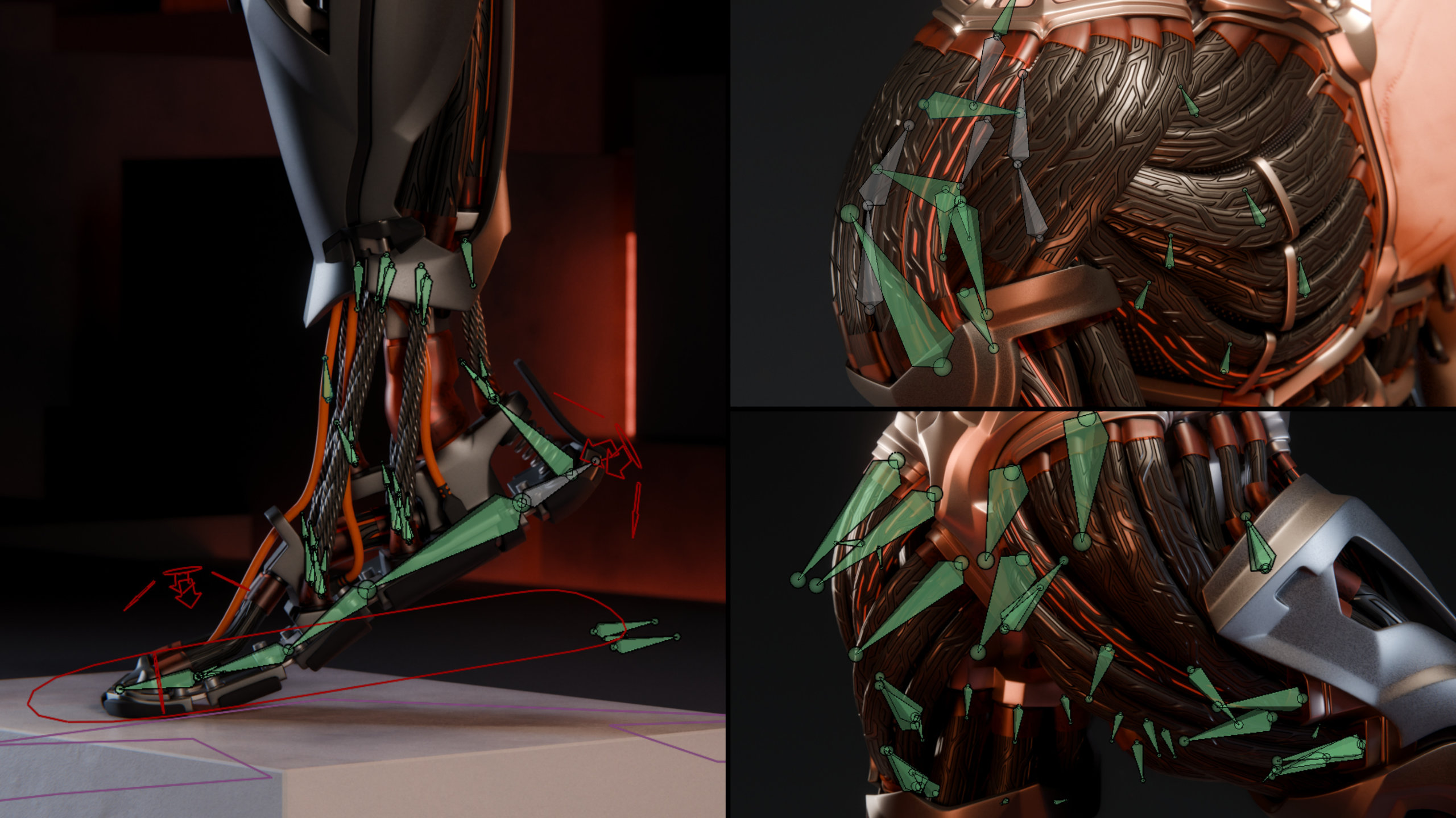 I have some rigging experience from previous projects, but nothing came close to the scale and complexity of this project. The base of this rig is the Rigify framework, which allowed me to do quick iterations and partial automation in the building process. Along with the standard rigify structures I built multiple new mechanics that for example keep the tendons around the ankle taut or control the curvature of the artifical muscle fibres. These mechanisms are fully automated, bu can be overridden by the animator if necessary.