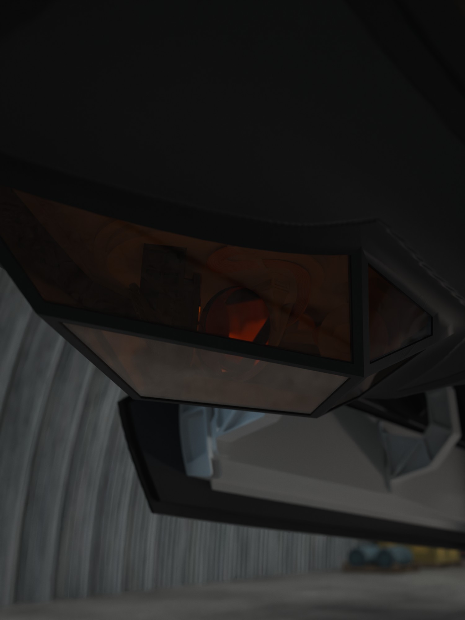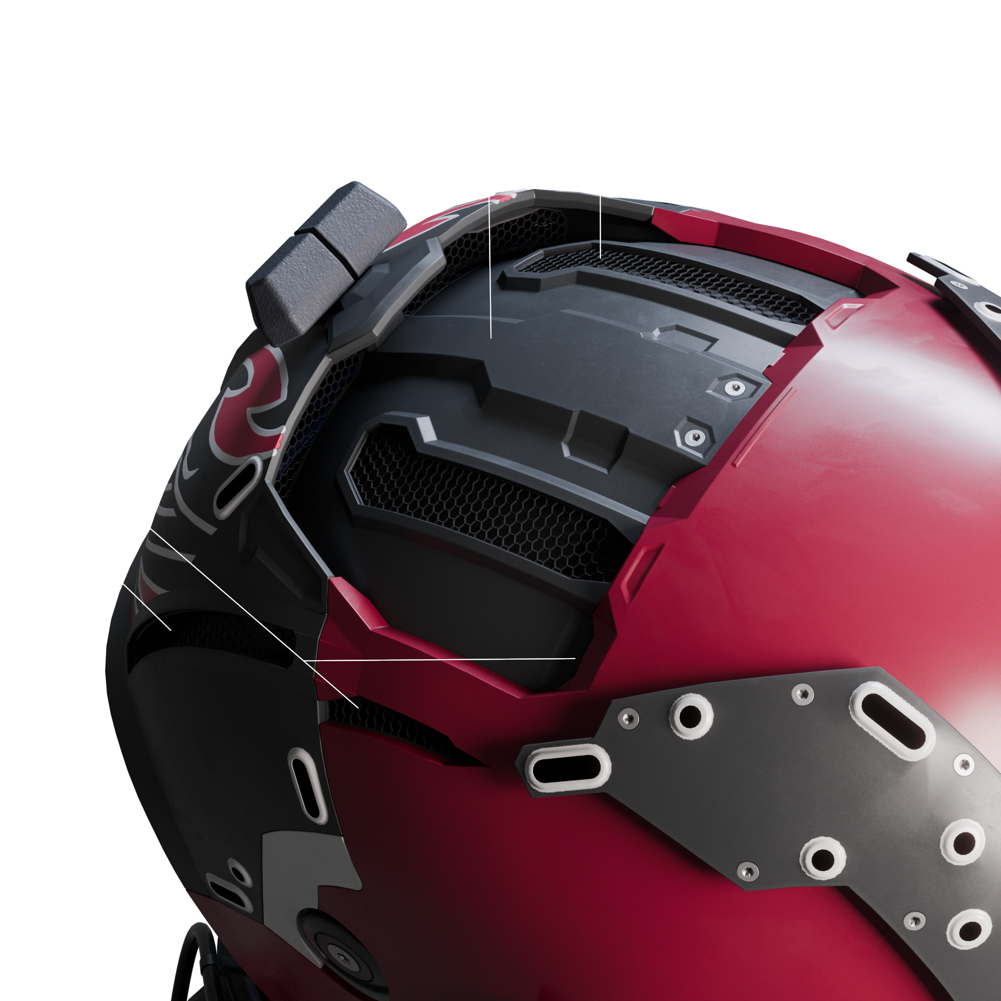 The projectors for the holo displays sit on the upper end of the forehead, with one projector per eye. Extra ventilation for these projectorstransports the heat away to the top of the head, where it can excape through two shafts. This assures that the helmet is comfortable to wear even for extended periods of time and tha the projectors stay at optimal temperature. There are also additional vents for passive ventilation directly to the head on the sides.