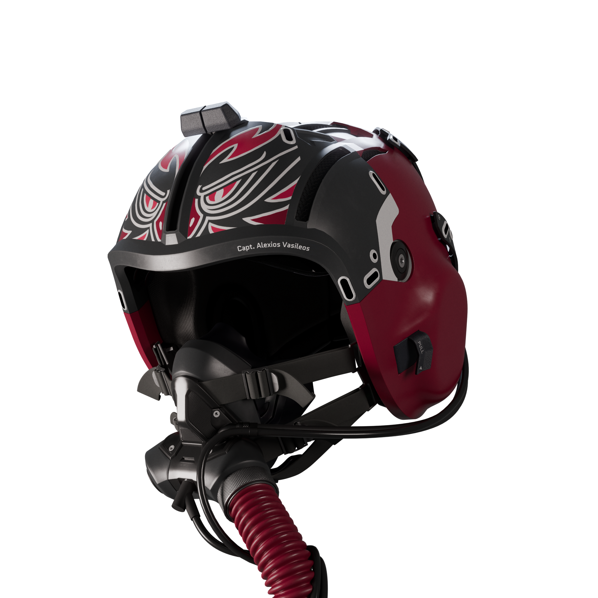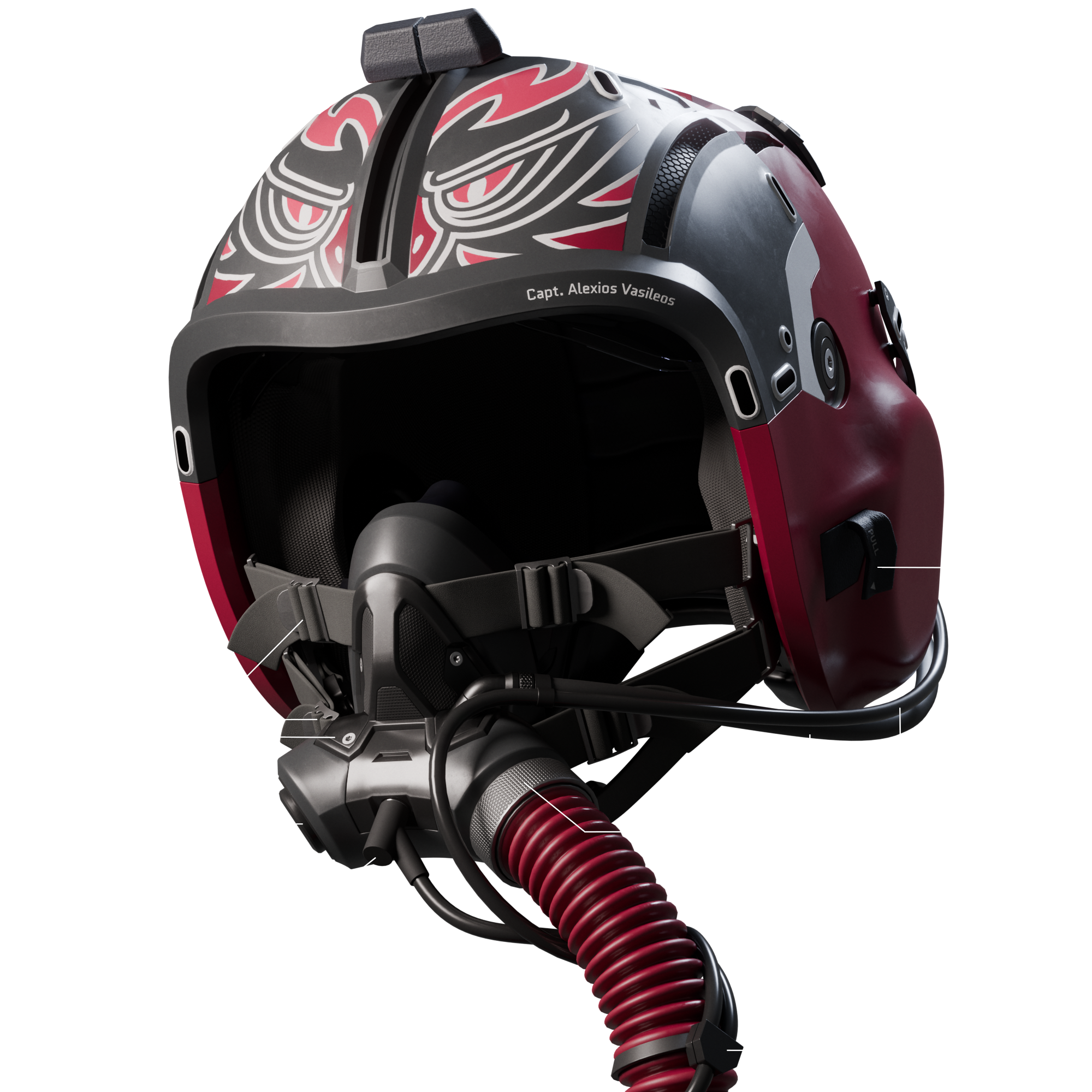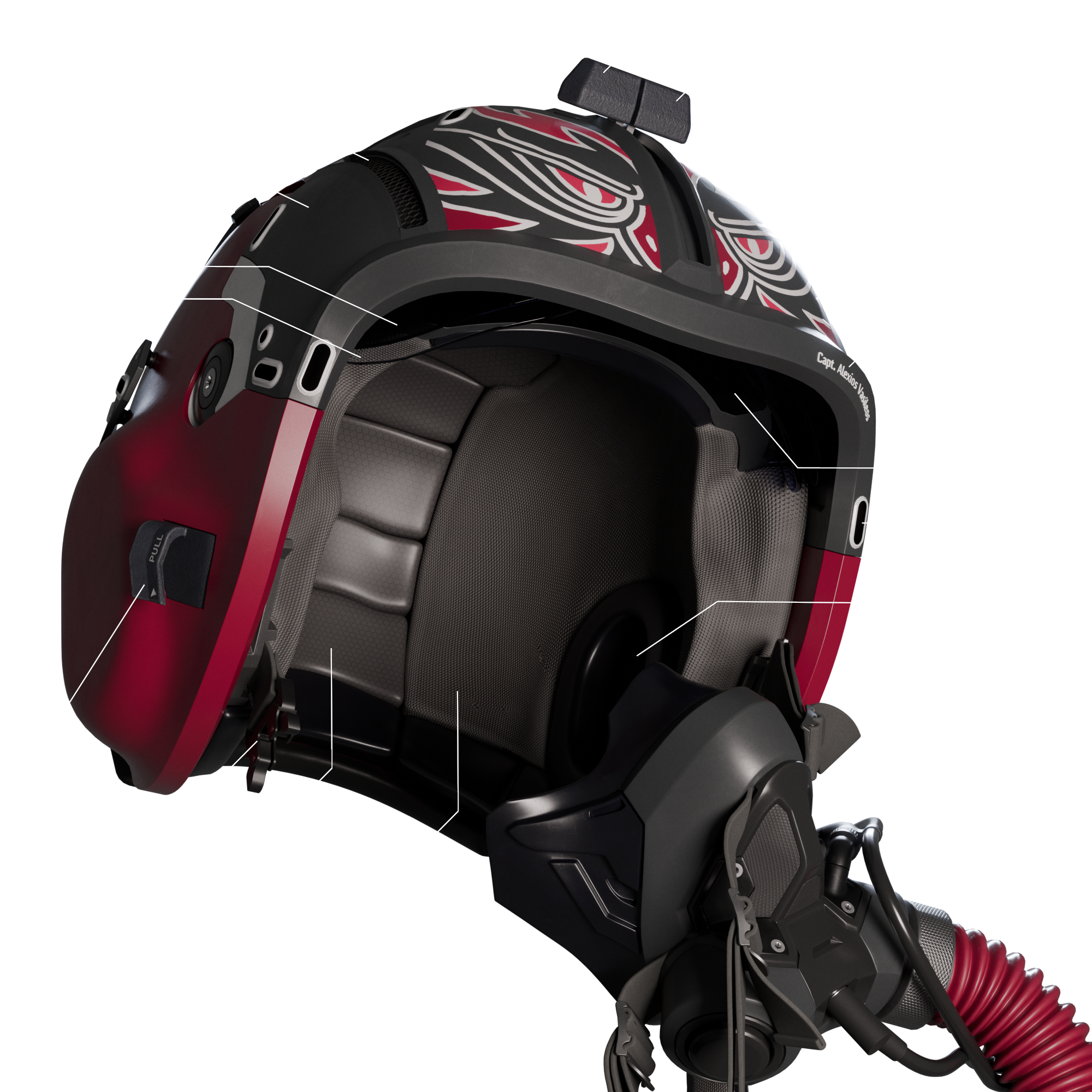 The helmet features a modular design, and this model is equipped with the projection tech. For other aircraft without the technology to make helmet-mounted HUDs work, it can be configured without these elements to cut down on cost, weight and increase part-sharing. The projection package consists of multiple elements all around the helmet. On the forehead sits a casing that houses the two visors. The inner clear visor serves as the canvas for the projection. A sun visor can be slid in front for comfort. The top of the visor module is used a lot by the crew as a canvas for personalization, and this one features the face of an owl. On the inside sits a covered foam liner, along with a pressure liner. Active noise-cancelling headphones reduce the loud engine noise and help with communications.