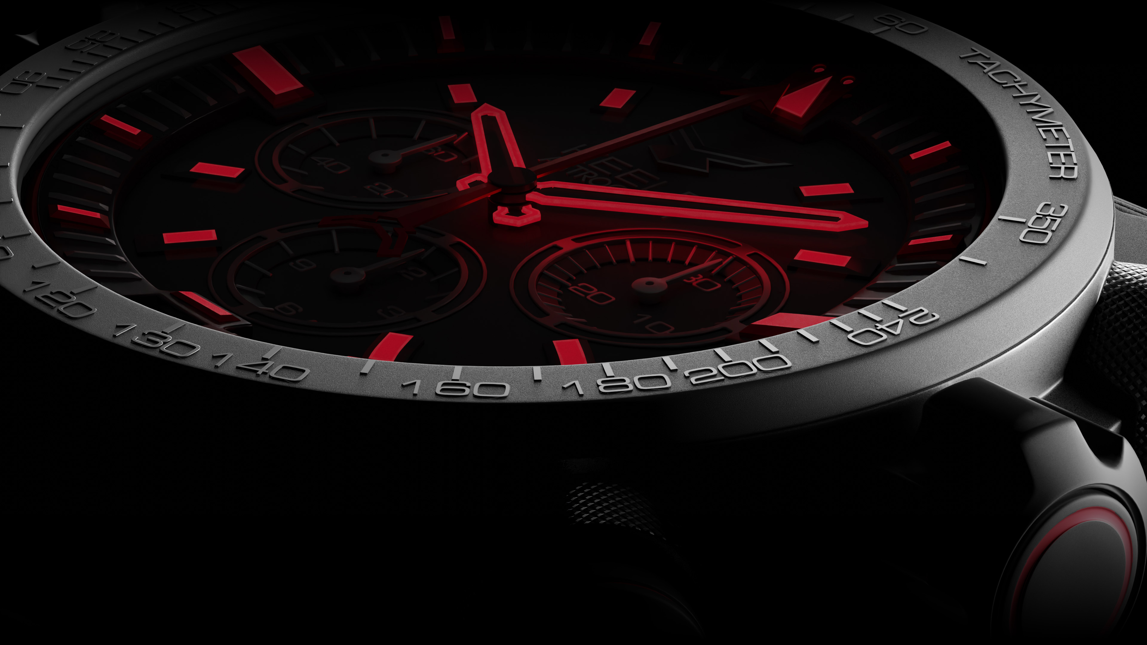 Most of the materials on the watch are procedurally generated inside the shader system of Blender. Only the fabric of the band and stitching uses an image texture as a base. The procedural approach allows for infinite scaling of the textures, so that no matter how close the camera is, the details of the materials will not get blurry. On top of the scalability, the watch can be toggled between different colourways on the fly through a switch inside the rig, and new ones can be added and synched to linked files.