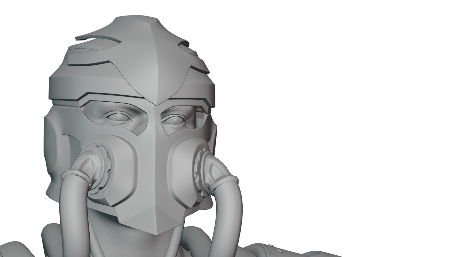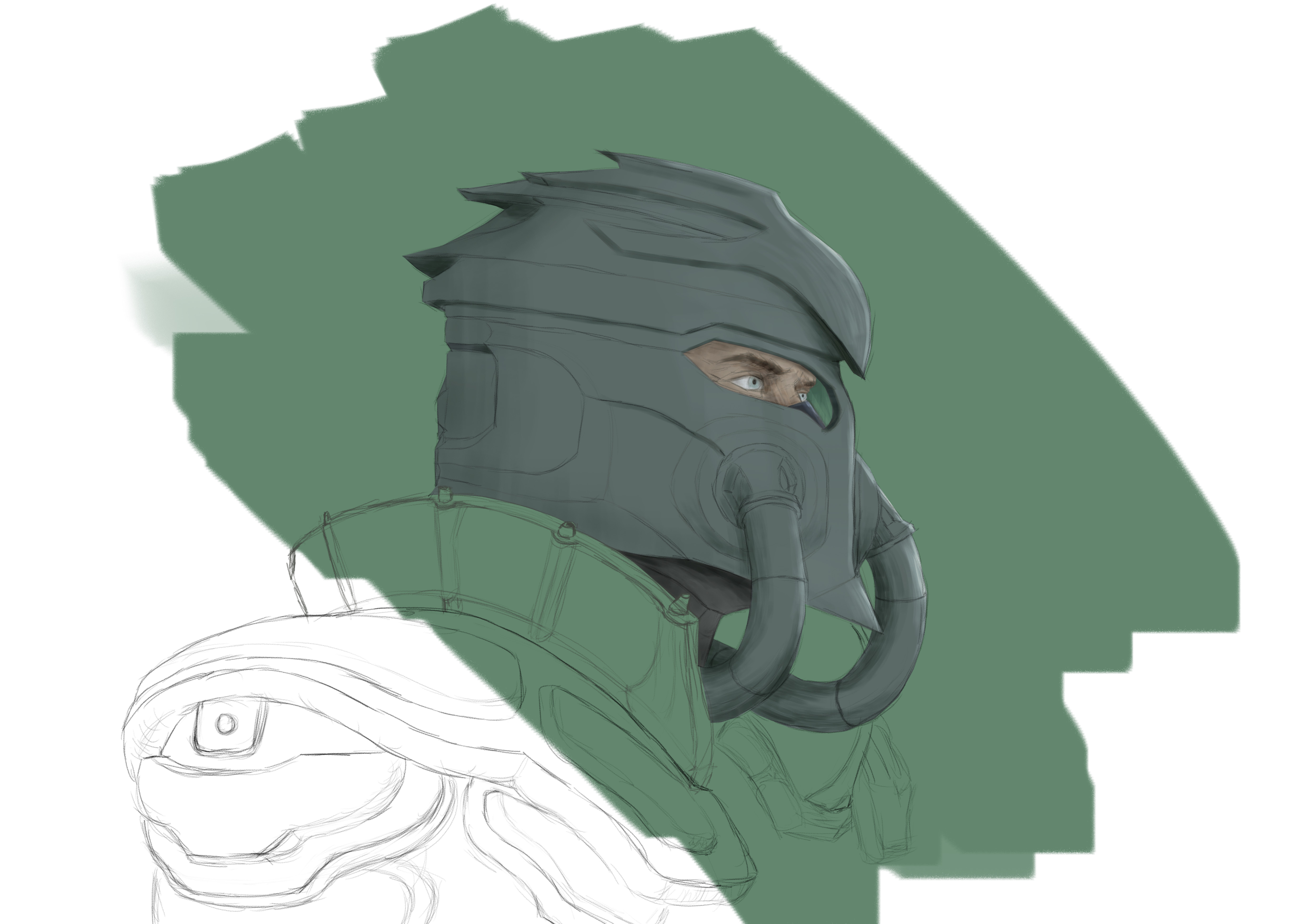 As I had also started with the head (or later helmet) in the concepting phase, I also started modelling here first, establishing the overall design language, defined by swooping lines and accentuated by sharp angles.Although not fully modelled yet, the helmet served as a guide for other elements.