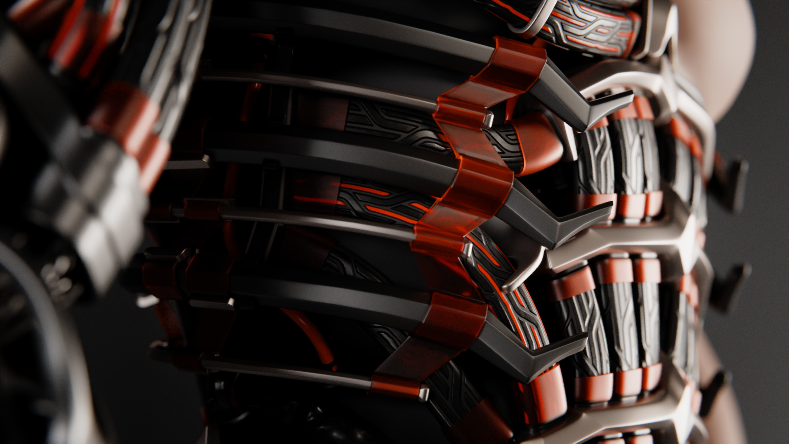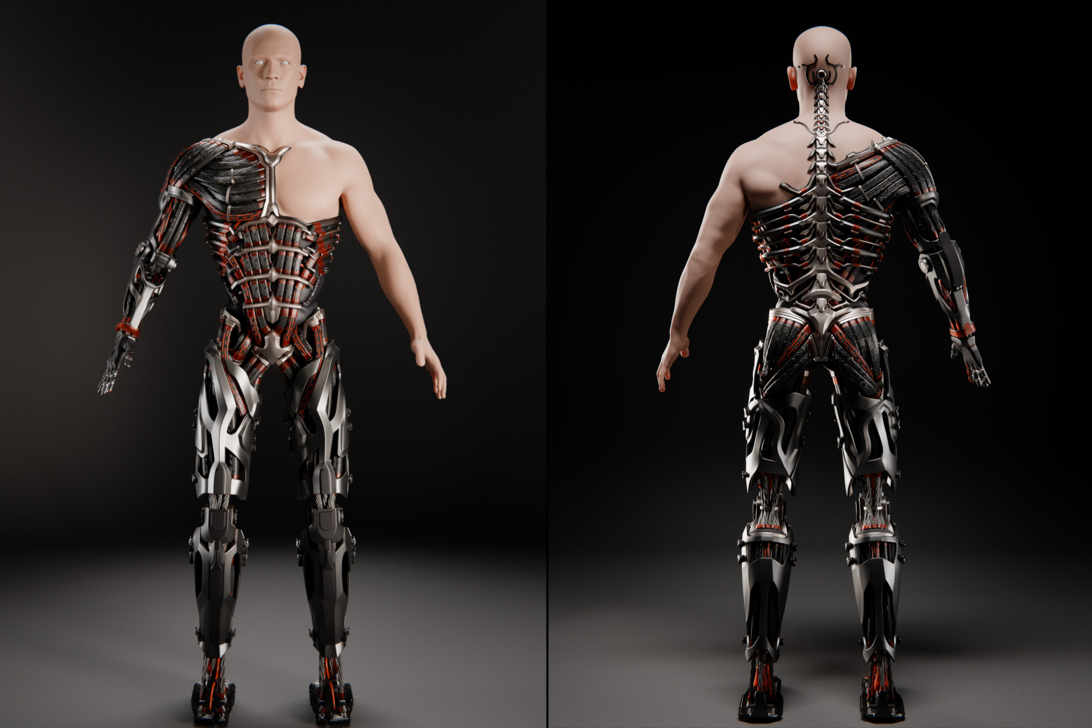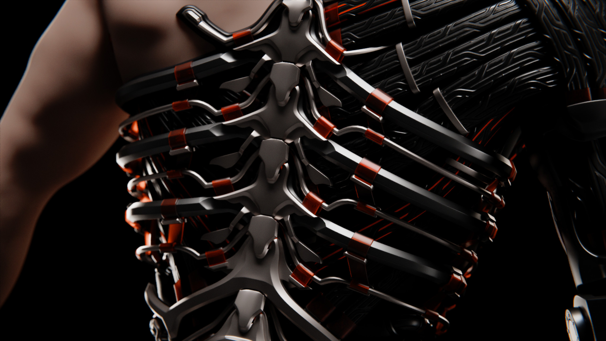 Just like the human spine, this cybernetic equivalent is the structural and neurological backbone of the body. It is segmented, with the segments changing size depending on their position on the spine. Cables connect the entire structure. The connection points are covered by metal flaps that stick to the segment below through magnets.