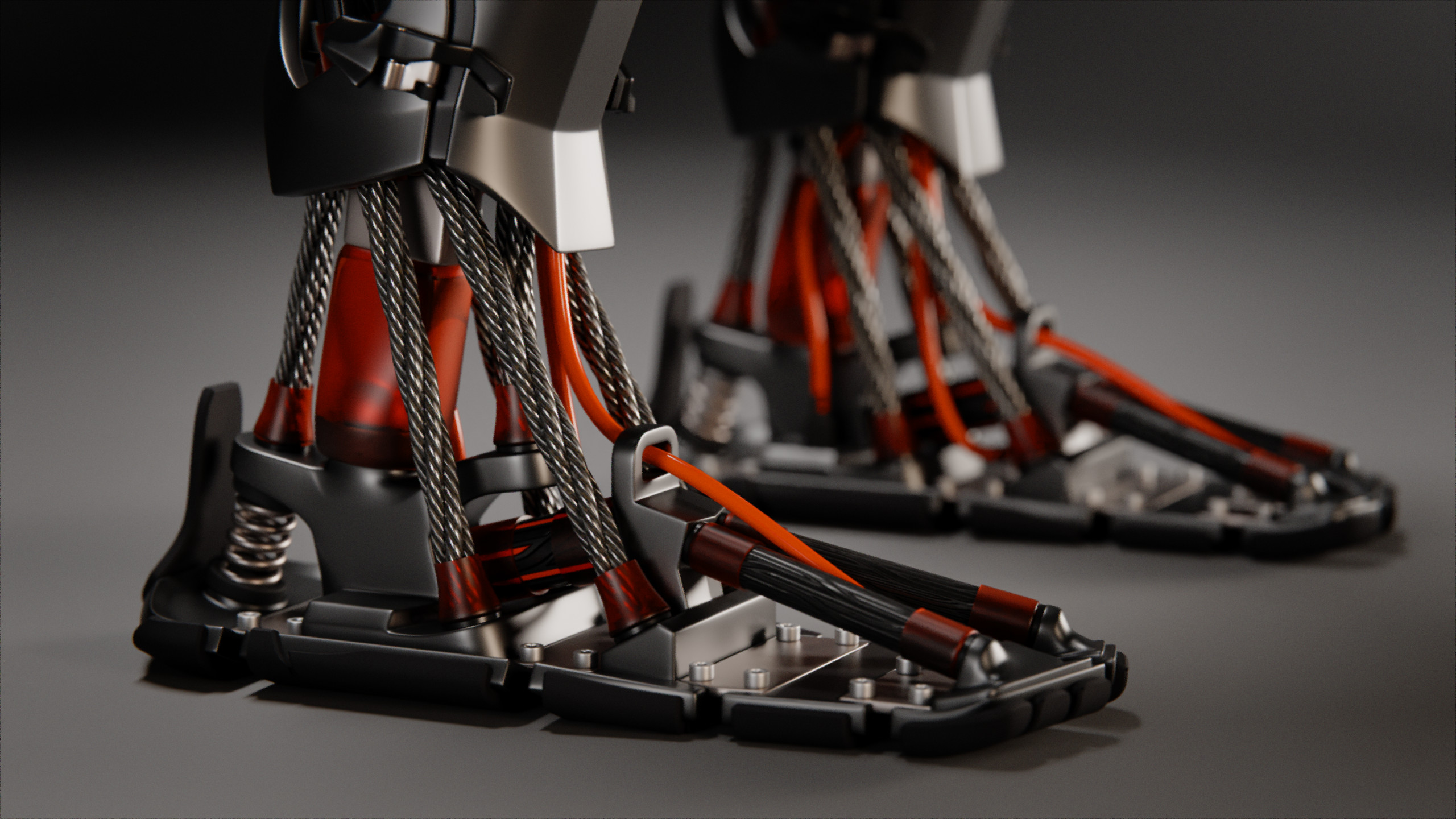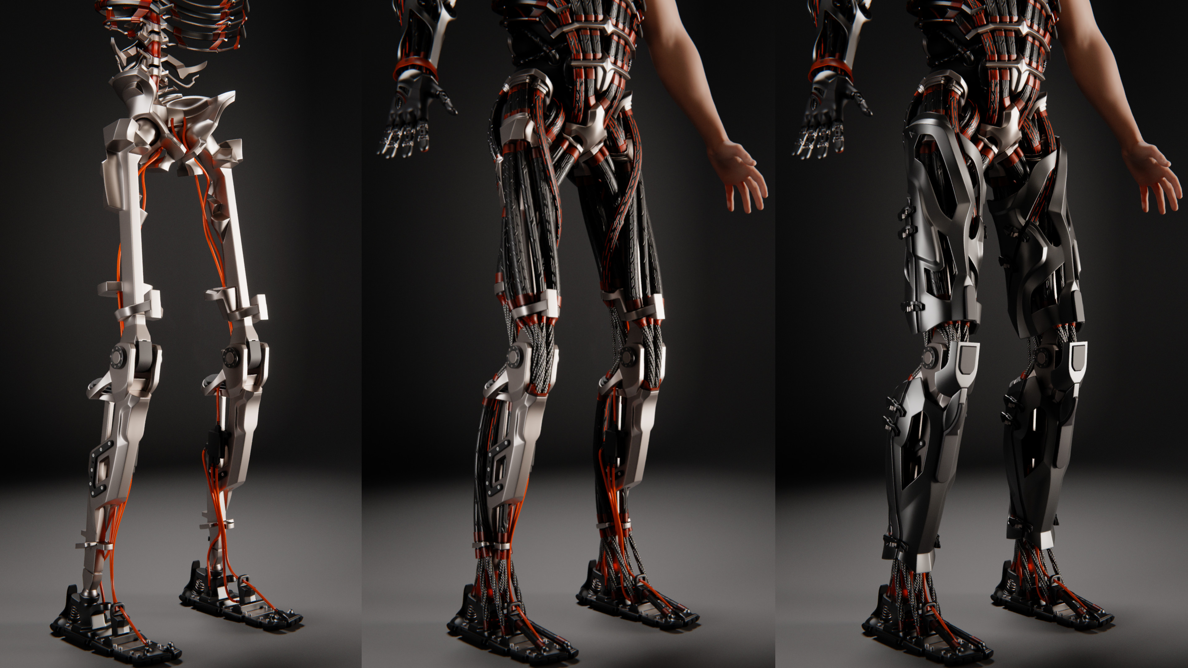 The legs are an intricate construction, with anatomy just like human legs. The bones and many of the muscle groups have been adapted to fit the overall design aesthetic. The front panels are designed in a way that they could be switched out for a different model with only a few screws. The back panels simply clamp onto the front panels.