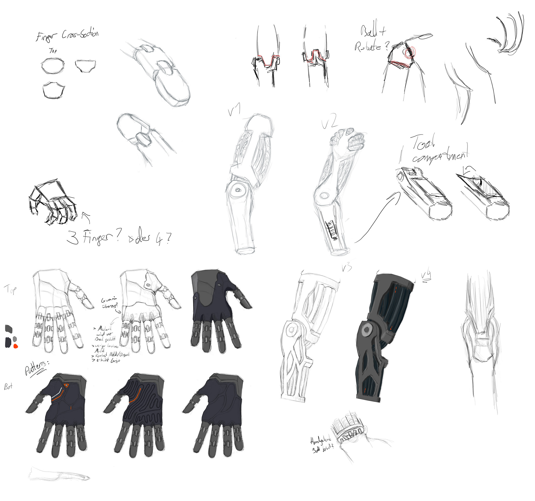 With the shift to a more humanoid design came the idea to have the body work similar to human anatomy on more levels than just aesthetics. I started and tested that idea on the arm and hand at first. The concept of artificial muscle structures was developed and finetuned with feedback from students and our professor. I also thought about possible materials and color palettes for the first time.